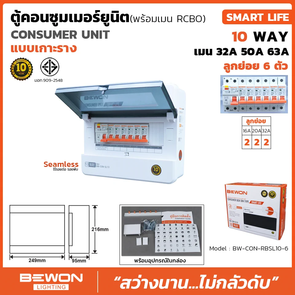 | SPECIFICATION ตู้คอนซูมเมอร์ยูนิตกันดูด RCBO เกาะราง SMART LIFE 6 ช่อง | |