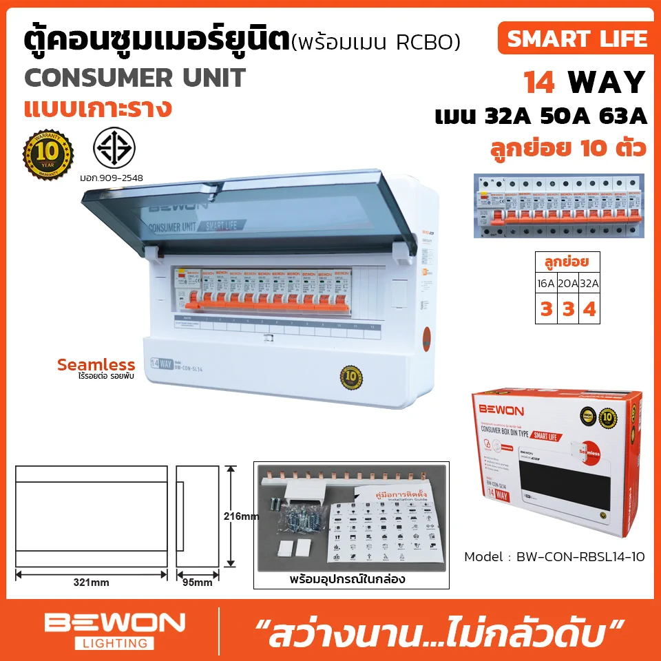 | SPECIFICATION ตู้คอนซูมเมอร์ยูนิตกันดูด RCBO เกาะราง SMART LIFE 10 ช่อง | |