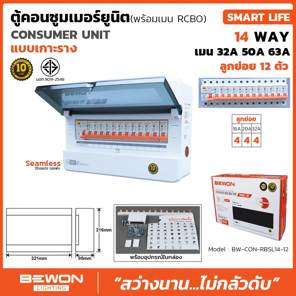 | SPECIFICATION ตู้คอนซูมเมอร์ยูนิตกันดูด RCBO เกาะราง SMART LIFE 12 ช่อง | |